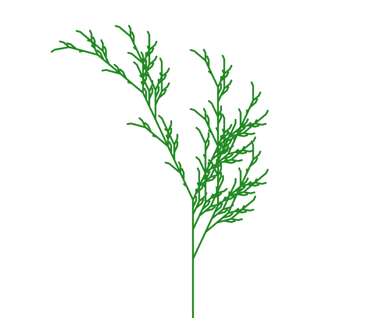 Now that we can produce L-Systems and render them with Turtle Graphics, it's time for some images! To generate different graphics, we need axioms and rules for the L-System and instructions on how the turtle should interpret each character. The fractal plant is a common example. The rules are:
